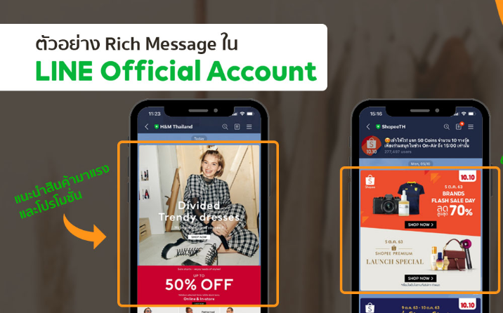 ช่วยให้ลูกค้าดูภาพขนาดเต็มจอแชทและเพิ่มความน่าสนใจของคอนเทนต์บนแชทใน LINE Official Account ของคุณได้ และด้วย Rich Message นี้แล้ว คุณจะสามารถกระตุ้นให้ลูกค้าคลิกไปยังหน้าซื้อ-ขายสินค้าอย่างได้ผลยิ่งขึ้น