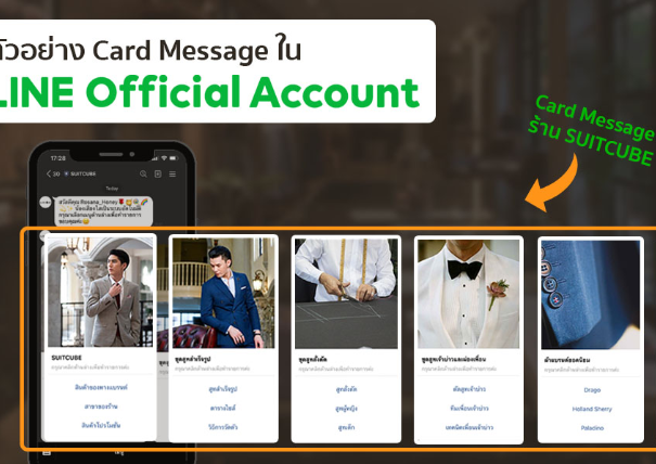 หรือข้อความแบบการ์ด มีหน้าตาเหมือนภาพสไลด์หรือ Carousel ช่วยให้ทางร้านนำเสนอสินค้าและบริการในรูปแบบที่แปลกใหม่ผ่าน Card Message 4 ประเภทด้วยกัน คือ สินค้า, สถานที่, บุคคล และรูปภาพ วิธีนี้เหมาะสำหรับการโปรโมทสินค้าและบริการเป็นอย่างมาก